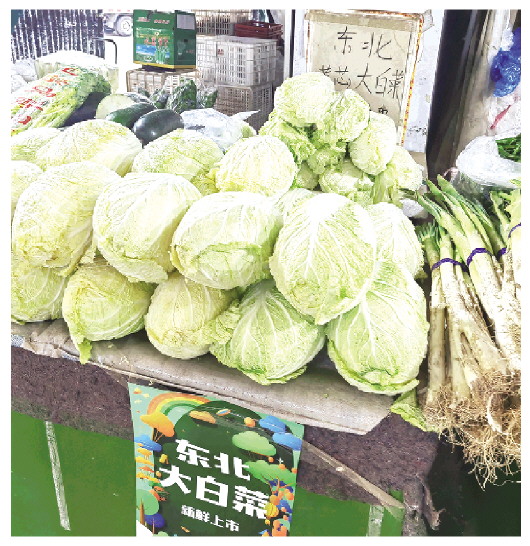 记者在潍坊十甲农贸市场上看到,很多摊位摆放着新鲜的白菜,不少商户还专门打出“东北大白菜新鲜上市”的招牌(上图)。“当地白菜1.5元一斤,品质差一点,从黑龙江运来的东北大白菜2元一斤,卷得结实。”一商户正向顾客介绍。