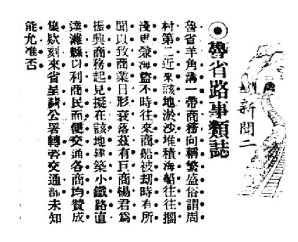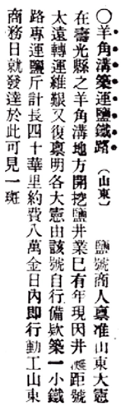 1906年,羊角沟远眺。 1907年7月25日《时报》报道。 1913年11月27日《新闻报》报道。 关于寿光运盐专用铁路的记载,有一说法是,1912年,山西汇兑庄老板徐济川投资,铺设从刘家呈子村至羊角沟的运盐专用铁路。此后,一杨姓商人牵头集资,欲修筑羊角沟至潍县铁路,终未落地;鲁丰纱厂又有建羊角沟至济南轻便铁路设想,同样没有付诸实施。寿光运盐铁路 一说山西银号投资修建 小清河轮船公司包揽了山东东部海盐运输,作为产盐要地的寿光沿海一带,如何提高运盐效率,一些有实力、有头脑的盐商,开始筹划修筑小型铁路。 据《时报》报道,1907年夏,一盐号老板禀报山东巡抚杨士骧,自筹资金,修筑一条小型铁路,专门运盐。这名盐商在寿光北部盐区晒盐多年,因为盐滩距离羊角沟码头太远,转运困难,决定自建运盐铁路。铁路计划建筑40华里,投银约8万两。 在这样一个规模不大的小商埠,商人自建小型铁路,全国罕见。《时报》誉称,“山东商务日就发达,于此可见一斑”。该报披露,铁路“日内即行动工”。不久,天津《大公报》报道了此事,称“闻已批准,不日即可开工”,《东方杂志》也作了报道,且称“业经莲帅批准”。莲帅即杨士骧,杨士骧字萍石,号莲府。1929年版《中国铁道史》载:“鲁抚代奏”“后未办”。 羊角沟何时开建铁路?20世纪初《寿光县志》没有记载,1991年版《潍坊大事记》载,“1902年(光绪二十八年)7月,烟台执印道台肖某在寿光县大家洼投资百万两白银建盐场,并铺设了轻便铁路,称寿羊铁路,后停废”;据1991年版《寿光县志》、1998年版《羊口镇志》等记载,清光绪三十年(1904),盐商投资兴建轻轨铁路,自刘家呈子村起至羊角沟止,长40华里,用以运盐。后因时局动乱拆毁(一说经营不善滩毁路废),称作寿光铁路,也叫寿盐铁路。 关于寿光铁路,1931年版《中国古今地名大辞典》载:“寿光铁路,在山东,自寿光县起,至羊角沟止,计长十五里。寿光县盐商所筑,亦名寿羊铁路。”1931年版《辞源·续编》亦载:“寿光铁路,在山东,自寿光县至羊角沟,长十五里,为寿光盐商所筑。”两书未写明铁路建于何时,资料也不知来源何处。 《潍坊大事记》载,1912年,“山西汇兑庄(银号)徐济川,投资营建寿光羊角沟至刘家呈子村运盐专用轻便铁路,建成总长20公里”。1992年版《山东盐业志》亦同样记载。巨商牵头集股 拟修筑铁路直通潍县 小清河轮船公司1908年开航,但随着小清河河沙淤积及羊角沟码头海沙堆积,行船渐难。加之河运季节性强,封冻和枯水期停航,大风、大雨、大潮时船亦难行,导致航运并不理想。胶济铁路由青岛至省城,贯穿山东半岛,串联起沿线数十个城镇,风雨无阻,四季畅通,有人又想到了铁路。 《新闻报》报道,1913年冬初,有杨姓巨商为振兴商务起见,拟在羊角沟建筑小型铁路,通至潍县城,“以利商民,而便交通”“各商均赞成集款”。杨姓巨商选择陆运的理由,除了以上原因,还有“淤沙堆积,海船往往搁浅”“海盗不时往来,商船被劫”等。 的确,对于小型商船来说,海运风险巨大。据天津《大公报》报道,1904年4月,有船户刘嘉宾与同乡梁金相等数人,从奉天装运粮食,行经羊角沟,遭遇风浪,粮食尽没水中。1915年6月初,五艘运粮帆船驶经羊角沟一带海面,突然飓风大作,其中一船因装货过多,不易转向,正在回舵之时,巨浪打来,船上35人被卷入海中,全部遇难。 杨姓商人将修建铁路的方案呈报山东都督兼民政长周自齐,请山东省公署转咨交通部,后来没了下文。 天津《大公报》还报道:“鲁省羊角沟一带,商务向称繁盛,俗谓周村第二”,但近年“商业日行衰落”。尽管如此,占据青岛和胶济铁路的日本殖民者还是瞅上了这里,要求开放商埠。1915年,《时报》北京6月1日专电称,日本方面宣言,山东开埠地点计高密、青州、德州、临清、羊角沟、济宁、兖州、沂州、博山、黄县十处,东蒙古计醴泉、开鲁、小库伦、林西、大赉、经棚、干泉、乌丹八处。中方予以坚决抵制,两个月后公布开埠地点名单,只将山东的龙口和东蒙古的洮南列为可开埠之地,山东的羊角沟等十地、东蒙古的热河等九地,“或为军事重镇,或为水陆要害,均不能开作商埠”。不少商家试水修铁路多因资金较大而搁浅 羊角沟作为山东官方极为重视的海河联运码头、沿海商埠,不少商家屡屡试水修铁路。 据《申报》报道,1918年6月,筹建中的济南鲁丰纱厂从海外购进一批机器。为运送机器及将来转运货物,鲁丰纱厂与津浦铁路局商定,鲁丰纱厂出资,津浦铁路局督建,修筑济南泺口至羊角沟轻便铁路。后因投资较大,项目搁浅。 四个月后,《民国日报》又报道,鲁丰纱厂股东、北洋政府全国水利局副总裁、署理总裁潘复到济,一是察看建设中的鲁丰纱厂,二是筹划山东交通事业、疏浚小清河。报道称,“潘氏久有恢复小清河交通以发展羊角沟商务计划,自本年四月起,即设立小清河测量事务所,从事测绘。现已将河身地形及羊角沟海口测竣”。 潘复此议,济南商界积极响应。不久,济南绅商各界开会集议,招股筹集资金,疏浚小清河,添购小型轮船,以利转运,并拟定简章,呈报北洋政府交通部立案。 1920年春,烟台巨商聘请两名日本技术工,在羊角沟制造锅炉客轮,功败垂成。 这年底,山东赈灾公会呈请北洋政府交通部,拟修筑潍县至羊角沟铁路,并疏通小清河,以抵制日本掌控的胶济铁路。因工程量大,资金难筹,遂告中止。第