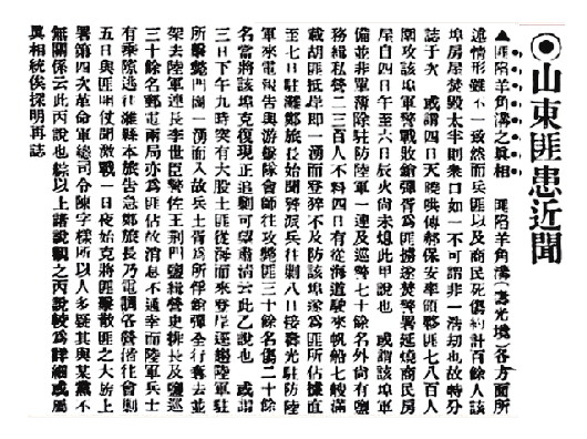 1918年9月13日《新闻报》报道。 1918年9月16日《新闻报》报道。 1918年10月9日《民国日报》报道(局部)。 1918年9月,陈巍唐与其弟陈保三率革命军数百人,一举攻占羊角沟。来自寿光县城、潍县城、青州城的数路北洋军相继赶到,进行围攻,革命军寡不敌众,撤离羊角沟。数家大报报道 多种说法真假难辨 1918年9月4日夜,革命军一部攻打羊角沟;5日黎明,革命军占领羊角沟。《申报》《大公报》《时事新报》《时报》《新闻报》等国内大报纷纷报道,但说法不一,真假难辨。 说法一:4日黎明,突闻枪声大作,子弹横飞,人声鼎沸,哗言匪至,争相逃避。午后,枪声顿止,哄传军警为匪所败,退出埠外,匪首郝保安入而占据,遂纵火先焚警署,大肆抢掠,凡属商店,靡不搜刮一空,并闻军警死伤甚多,枪弹胥为匪掳。自4日午刻火起,至6日辰刻,火势犹盛,计两昼夜,匪尚占据未去。 说法二:4日由海道突然驶来帆船八艘,约载胡匪七八百人,蜂拥登岸,猝不及防,遂为匪乘。军警均已缴械,陆军连长李世臣、警佐王荆门、警局李谦,闻亦被架去,商民损失不下百余万。 说法三:3日晚9时,由大连驶来帆船七艘,所载均属土匪,约七百余人,突然登岸,直扑陆军驻在所,先将门岗两名击毙,该军兵士均熟睡不觉,故胥为匪缚。该军及连长及警佐与盐务缉私营排长某,巡兵30余名,概为匪徒架去,所有军警枪弹全行夺去,邮电两局亦为匪占。 说法四:胶东各属发现党人薄子明(前周村民军司令)及安仁(前济南警察厅)之起义通告已非一次,日前派同党陈伟堂(前民军营长)、张书业占据该埠,即以靖国军名义宣布独立,除将军警枪弹一律收没外,并责成商会代募军费20万,所以人民未遭抢架之惨。 说法五:4日黎明,至羊埠下船时,即有二百七八十人。该处因连日戒严,军警劳顿,天已拂晓,以为可稍休息,不料该匪趁此时机,直将连部围攻。军士闻警,开枪迎击,匪已不支。该匪遂声言议和,而连长某竟不假思索,只身前往,被匪扣留,勒缴枪支子弹,否则以枪弹对付,不得已即将武装完全交付。各街巷口均由该匪设立岗位,商户似未大受损失。 北洋政府污称革命军为“匪”,对陈氏兄弟所率部队,报纸报道多以“匪”相称。官军多路围击 寡不敌众功败垂成 据《羊口镇志》记载,1918年9月4日夜,陈巍唐、陈保三兄弟二人率部乘船自东边进入羊角沟,将军阀兵营悄悄包围。午夜时分,全军出击,并诈呼敌连长已投降,乱其军心。此时,军阀兵大部已睡下,有的到营外吃喝嫖赌,其连长正在同盛公酒楼上寻欢作乐。全连闻听枪声,乱作一团。战至黎明,革命军大获全胜,缴获步枪100余支,子弹20箱。陈氏兄弟部队军纪严明,对百姓秋毫无犯,羊角沟的人民群众称之为义军。 羊角沟被陈氏兄弟部队攻占的消息传出后,官府大惊,连发急电,四处呼救。第二天下午,县知事同北洋军辎重营营长吴可章率数倍于革命军的兵力进行反扑,在羊角沟南边和丁家庄子、单家庄子驻扎,陈氏兄弟即令全军设防坚守。当夜,吴军偷渡水沟子,绕至羊角沟东侧,进行强袭。革命军英勇善战,迎头痛击,使之未能得逞。第三天中午,由县城出发的警备队赶到羊角沟,潍县、烟台军阀部队亦相继赶到,他们联合起来进行反夺。激战半日,陈巍唐负伤,终因兵力悬殊,寡不敌众,革命军撤离羊角沟,开往广饶一带。 《羊口镇志》所载,系据相关知情人口传材料整理。前述报纸报道,印证了《羊口镇志》记载,提供了一些未知史料,也有不少疑点。 报道中所述陈伟堂即陈巍唐,寿光南陈村人。1916年,陈巍唐与其弟陈保三一起加入中华革命军东北军,参加讨袁斗争;5月,陈巍唐随部攻占潍县城,被任命为该军一师二旅六营营长。二旅旅长赵中玉是寿光赵家村人,部下官佐多系山东籍,不少是寿光人。 关于这支队伍的名称,前述报道称为靖国军,又有报道称,“所悬大旗上署四次革命军总司令陈字样”。辛亥革命失败后,孙中山相继领导了三次革命运动:1913年发动讨伐袁世凯的战争,称为“二次革命”“讨袁之役”等;1915年底袁世凯称帝后,孙中山组建中华革命军,于1916年发动反袁军事斗争,称为“三次革命”,陈巍唐所在的东北军,即中华革命军四支部队中规模和影响最大的一支;1917年,孙中山发起反对北洋政府的行动,称为“四次革命”“护法之役”。“四次革命军”之称,令人费解。这支部队另一位将领张书业,未查到相关史料。突围一年之后 陈氏兄弟不幸遇害 革命军9月5日凌晨打下羊角沟,当天下午3时左右,北洋军数路部队陆续抵达羊角沟一带,进行会剿。此时情况,多家报纸予以报道。 羊角沟被攻占的消息是如何传出的?有报道称,羊角沟邮政局与电报局均被占领,“幸陆军兵士乘间逃赴潍县本旅报告”。 参加会剿的北洋军,综合各报报道,计有驻潍县陆军第五师第十旅旅长郑士琦所派一个营,寿光驻军一个连,青州驻军派机关炮队一个连,广饶驻军一个连,烟台所派兵轮一艘。革命军队伍数量,有二百七八十人、五百余、七百余、七八百人、千余之说。中华革命党机关报《民国日报》称,只有八十余人。按当时情况分析,第一种说法较为符合事实。当年陈巍唐参加的中华革命军东北军,由居正率领攻打潍县城时,也不过1200人左右。 关于作战过程,《民国日报》称“血战三日”,多数报纸称“激战一昼夜”“激战一日夜”。一支二三百人的队伍,要抵抗两个多营、两千人左右的联军,且不说武器的差距,很难支撑数日,