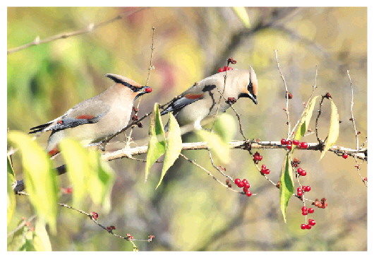 冬日里,河畔忍冬木的枝条上结满鲜红的小果实,一群奇特的鸟儿飞来,不停啄食这些浆果,俨然在参加一场盛大聚会。这些小精灵便是小太平鸟和太平鸟,外形可爱、长相讨喜,虞河景区、市人民公园和郊区都出现了它们的身影,为冬日增添了更多生趣。 本报记者 巩建国