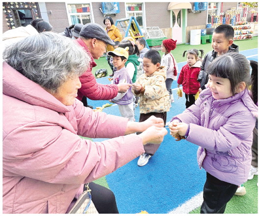 11月24日,在奎文区东关街道工福街社区,居民们正在进行“拔老根”游戏。又到一年落叶季,树叶已纷纷飘落,当日,该社区开展了一场“拔老根”活动,居民们捡起地上枯黄的落叶,将柔软的叶柄叠交成十字状,二人一组,各自捏住叶柄的两端拉扯,就像拔河一样,活动现场,男女老少齐上阵,欢声笑语不绝于耳。 本报记者 张驰