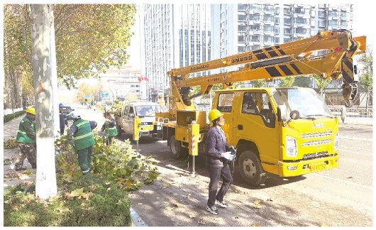 记者走访奎文区、高新区、潍城区、坊子区的绿化养护现场看到,高空作业车正在忙碌作业,园林工人头戴安全帽,携带专业剪枝工具等设备,分工协作开展作业——高空作业人员精准剪切超标枝条,地面人员及时疏导过往行人和车辆、快速清运修剪下来的枝条(如图),整个流程高效规范。为最大限度减少对市民出行的影响,此次专项行动特意采用“错峰作业+安全防护”模式,避开早晚交通高峰时段,现场设置反光锥、安全警示牌,并安排专人引导交通,实现养护作业与交通秩序的无缝衔接。