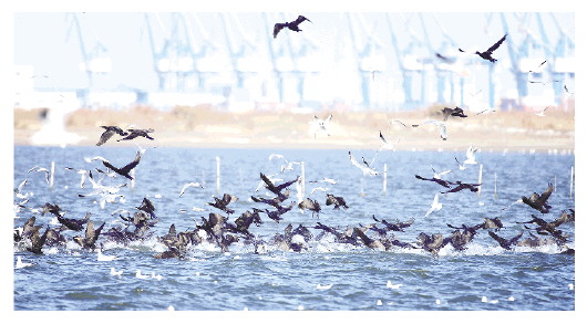 11月25日,在滨海区一处海域,成群的红嘴鸥和鸬鹚在水面上齐心协力捕鱼。鸬鹚在水里赶,海鸥从水面啄,场面十分壮观。不远处的风车正旋转发电,港口的塔吊也成为忙碌的背景板,构成一幅生态优越的和谐画卷。 本报记者 巩建国