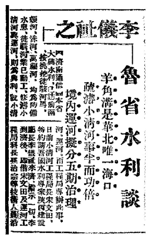 1931年第5期《山东建设月刊》所刊《整理小清河计划书》(局部)。 张鸿烈 1931年3月22日《益世报》天津版报道(局部)。 在羊角沟,宋文田通过仔细勘察,分析比较治理小清河海口的各种建议,拟出疏浚淤沙的具体方案。李仪祉再次来到山东,赶赴羊角沟现场勘察,提出疏浚海口、建设羊角沟海港的建议。仔细鉴别比较论证治淤方案 对于小清河海口的整理,有多种方案。在羊角沟,宋文田边勘察边思考,仔细斟酌各种方案的可行性。 有人建议,在小清河下游筑堤,直达海口,是想“以堤束水,以水攻沙”,海口不挖自辟。但用水力攻沙,流量必须极大。小清河流量,最盛时不过每秒55立方米,“其水流之力,甚形微弱”。况且入海处,河身不能太窄,至少须有平均3000米的河宽,四五米以上水深。小清河海口流速最高每秒0.04米,流速在每秒0.15米以下,无挟带沙土能力。宋文田认为,“以水攻沙之说,决为不可”。 另外,筑堤的作用是防洪水泛滥,所以堤高必须在最大潮水位以上。小清河自桓台闸至羊角沟海口110华里,河堤多残缺不全,如筑堤220华里,需资金不下数百万元。而且河堤必须坚固,才能抵御潮水冲击,土堤肯定不行,如果筑石堤,花费更大。宋文田从经济角度,分析了筑堤方案的不可行。他考虑,筑堤是必须的,但“筑堤之地点,在河口并非在河身”;筑堤目的是间隔海口两旁的流沙,以利挑挖。 对于小清河的将来,宋文田考虑得很长远。他认为,待条件成熟,在小清河海口一段修建石堤,应当是可行的。但小清河两岸及羊角沟附近没有山岭,无处采石。宋文田提出,将来建筑石堤时,所需石料等恐怕要从济南水运,省政府已决意拆掉济南城墙,砌墙砖石“与其感堆置之无地”,“不如由小清河运往羊角沟,作为筑堤及其他建筑物之用,诚为一举两得”。 宋文田设想,济南环城皆水,石料运输全由水路,十分方便。东、西、南三关的围墙,虽距河远近不同,但拆下的砖石堆置无用,也可运到羊角沟,筑成堤防,“俾河流纳入正槽,免生灾患”。“他日海轮河船,直达济南,航行之发达,宁非有望乎?”想到这里,宋文田思绪纷飞:“是不独济南拆城多所裨益,即小清河口之疏浚与羊角沟之建造,亦利赖焉。”浚挖海口淤沙 成为小清河工程关键 宋文田拟订的《整理小清河计划书》,对小清河河槽情况进行了概述。根据勘察结果,宋文田将小清河划分为22段,其中接近羊角沟的辛庄至八面河村一段,长约10华里,水面渐渐宽展,两岸较前一段低,田地里种有高粱及棉花之类。靠近河水之处,多生水草。八面河村至羊角沟一段,长约15华里,河底坡降约每11000米低1米,“河流变迁无定,两岸时有模糊莫辨之状”。河岸外是荒滩,如前所述,一望无涯,没有一棵庄稼。 宋文田分析小清河“致病”原因,一是河水“来源较弱,水量不足”;二是上游坡度太陡,不能蓄水;三是河槽浅狭,容量太小;四是海口水流冲刷力量弱,沙层日益增厚,海轮巨舶不能驶入河门;五是支流过多,水库太少,不足以资节蓄。 宋文田建议,小清河疏浚工程分为四期。第一期1930年底开工,疏通济南附近航道;第二期1931年施工,整理干流、河堤及羊角沟海口,小清河全线通航;第三期1932年施工,整理支流及湖泊;第四期1933年施工,连通黄河与小清河航运。 关于海口整理,宋文田写道:“海口一带,沙洲日涨,横亘河门。此由河面展宽,流速锐减,沙层沉积,河床益高。倘能及早治理,则海轮巨舶,可以驶入内河,内外交通,既均便利,各埠商业,自必蔚然繁盛,民生国计,实多利赖。” “浚挖小清河口之沙洲,实为当务之急”。宋文田核算海口挖沙工程量,沙洲长约2500米,宽约100米,深约4米,共计100万立方米。挖泥机工价,每立方米2角5分,计25万元;购买大号挖泥机一台,约20万元,需资金共计45万元。 寿光境内的清水泊治理,在第三期工程内。清水泊方圆50华里,淄河流入。工程完工后,“以尽吐纳之利,而收宣蓄之功”。李仪祉现场勘察 提议建设羊角沟港口 1931年3月中旬,导淮委员会委员、陕西省建设厅厅长李仪祉再次来到山东,宋文田陪同,乘船对小清河全线实地考察,重点勘察了羊角沟海口。 在羊角沟,宋文田与羊角沟各界设宴欢迎李仪祉。席间,李仪祉专门谈及羊角沟辟港的利益。李仪祉认为,黄河有治导而开为航道的可能,然后与运河连通,“为中国腹地交通之大利器”。然而黄河海口淤沙,无法建港;华北北部的旅顺、大连港被日本占据,葫芦岛虽然建港,但规模不大,天津港苦于海河淤塞,发展困难;华北中部只有青岛港较好,但无河道与内地连通;华北南部将来导淮实现,才有良港连通内地。连通内地的良好海港,“即今来查勘之羊角沟海口”。他建议,羊角沟海口用挖泥船挖去泥沙,小清河建闸三道,五六百吨汽船即可入口,直达济南商埠;由黄台桥沟通小清河与黄河,黄河汽船即可驶入小清河,“羊角沟将为华北惟一海口”。 对于羊角沟建港的前景,李仪祉预测,小清河与黄河连通后,“浅水汽轮穿豫晋而达陕境,则黄河流域各省货物,东西由黄河,南北由运河,以入小清河而达羊角沟之海口”,商业之发展,“裨益于华北各省人民之生计,殊非浅鲜”。 3月22日下午3时,山东省建设厅厅长张鸿烈召集会议,听取李仪祉意见。李仪祉提出,“羊角沟的门滩沙不是小清河生的,乃是由黄河而来的,往往河水愈涨滩沙愈宽,如能深谋远虑,用人工挖好,使河水有合宜的深度,并择要置三长闸,便可容五百吨的汽船”