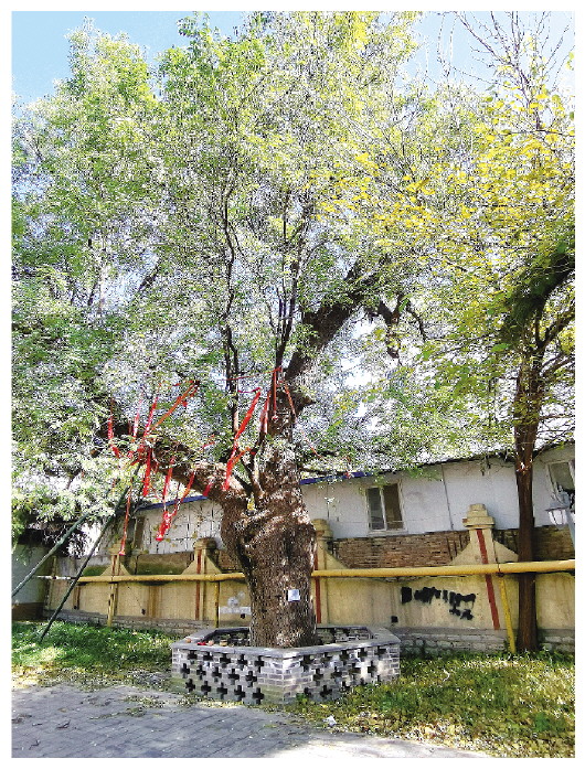 从东风西街入口走进颐园,在公园东北角位置,砖块垒砌的一方天地里,一棵古槐静静伫立,树冠亭亭如盖、树叶倔强地立在枝头,与斑驳皲裂、满是岁月刻痕的树干形成鲜明对比。这棵古槐树干粗壮,需两人张开双臂才可环抱,在距离地面约2米的位置,岔出几根枝干,每根枝干如同小树般粗细。走近细观,树皮如龙鳞般斑驳脱落,老枝虬蟠盘曲;远望,整棵树给人一种苍劲挺拔之感,展现出顽强的生命力。