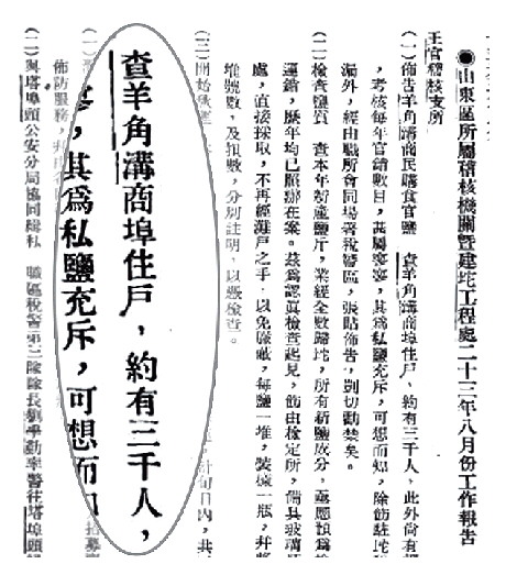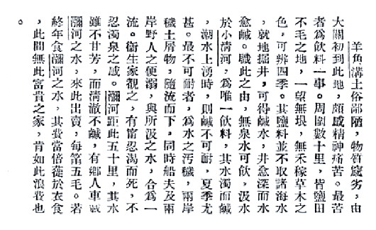 小清河羊角沟入海口远眺 1935年第12期《关声》杂志所载羊角沟吃水情况 1934年第51期《盐务汇刊》所载羊角沟人口情况。 羊角沟一带,除了盐田就是荒滩,自然条件差,环境恶劣,吃水困难,且极不卫生;当地人为保护自己的利益,对外来经商者极为排斥,甚至动用特殊手段。 四野都是盐碱地 饮水问题最头疼 “周围数十里,皆盐田不毛之地,一望无垠,无禾稼草木之色可辨四季。”羊角沟自然条件差,环境恶劣,曲滋田极不适应:“由大关初到此地,颇感精神痛苦。”自然,羊角沟各方面条件较龙口要差不少,更不用说东海关驻地烟台。 最令曲滋田头疼的是饮水。晒盐之水,多数并不取诸海水,“就地掘井,可得咸水,井愈深而水愈咸”。从井里打出来的水都是咸的,当然“无泉水可饮”。羊角沟饮用水的唯一来源,便是小清河。 小清河是羊角沟的母亲河,一河一海,养育了羊角沟百姓以及无数来此淘金的外乡人。但是,羊角沟海滩漫长,海水内侵严重,导致此处河水浊而咸,“潮水上涌时,则咸不可耐,夏季尤甚”。 令人难以忍受的是河水污染,一则“两岸秽土屑物,随流而下”,二则“船夫及两岸野人之便溺,与所汲之水,合为一流”。曲滋田感慨:“卫生家观之,有宁忍渴而死,不忍浊泉之感。”距羊角沟最近的一处水源地,是数十华里外的弥河,“其水虽不甘芳,而清澈不咸”。有人用驴车拉弥河水来售卖,每桶五角,赶得上一斤猪肉的价钱。“若终年食弥河之水,其费当倍于衣食”,曲滋田感慨道:“此间无此富贵之家,肯如此浪费也。” 羊角沟除了鱼和盐,其他物产几乎没有,全部靠外运,食品和生活用品价格较高。一斤猪肉,要大洋五角,有时稍微便宜些。曲滋田虽没有与内地猪肉价格比较,但估计肯定高出不少,其他物品“皆货劣价昂”。曲滋田言:“欲求物质享受,则不可得。”倒是有做济南菜的三家饭馆,“颇为适口,价亦不甚贵”。济南菜又称历下菜,以清、鲜、脆、嫩著称,口味以鲜、咸为主,极为符合像羊角沟这样北方沿海一带人的口味。 羊角沟虽然生活苦,却有一现象令人不解。羊角沟人喜欢养鸟,不论贫富,无不人手一笼。“衣食不裕者之苦力,往往手提华丽之鸟笼,价值十金”。 皆为生计所迫 当地人排外风极盛 作为旁观者,曲滋田评价羊角沟本地居民:“鄙野多诈,而耐勤劳,菲食恶衣,亦足自给。” 勤劳朴实是寿光人的本色,曲滋田以“城里人”的视角审视寿光北部沿海居民,鄙陋粗野无疑;称之为“多诈”,应当是环境所致,匪患世代连绵,外乡人频至久驻,羊角沟人不得不多个心眼;至于“菲食恶衣”,前面宋文田在《小清河口水利调查》一文中提及,当地渔民讲究吃,而不讲究穿,生活宽裕者照旧粗衣布衫。 羊角沟有店铺百余家,老板大多是当地人,即坐地户。曲滋田称羊角沟“排外之风甚盛”,“为其劣根性”,并以其家乡胶东作比:“吾胶东人遇异乡人侨居本地者,邻右送衣助食,有古人推解之风、守望相助之义”;“羊角沟土著,极尽排外之能事,贩夫走卒,咸知仇视远客”,“异乡人来此经商者,非用当地人执其店政,则掣肘之多,直无以进行”。 其实,这种劣根性在其他地方也普遍存在,其中不乏大都市。对羊角沟人来说,这或许是维护自身利益的不得已之举。否则,这样一个处在荒滩之中的小商埠,很可能被异乡人掌控,当地人全部沦为纯粹的“打工仔”。 曲滋田甚至举了一个极端的例子:十年前,一胶东人来此经商,自己当老板,没有聘请当地人,当地人暗中唆使一帮无赖之徒,日夜临门叫骂,并乘夜将粪便抹在其门窗上。不过“近年此风稍杀”,开店的异乡人只要小心翼翼,与当地“土豪”处理好关系,就不会有麻烦找上门。 据曲滋田了解,羊角沟单、孙、丁、袁四姓势力最大,其中又以单、孙二姓为强,凡事他姓不得染指,异乡人更不用说。他们除了海关、税务两大机关不敢得罪,其他的驻羊角沟机构,“彼等必威胁利诱,希图分润”。最难受的是公安局长,必须八面玲珑,“与彼辈声应气求,有求必应”,甚至对于四大姓的女人和孩子,也要虚与委蛇,不然,公安局长的位子就坐不长。曲滋田又称,“寿光人好讼,一拂其意,即藉端联名上控”,这纯是站在官府立场说话。国运衰微,官僚乱为,民不聊生,百姓有难,若不上告,焉有活路?! 特产有鱼虾和盐 食盐远销周围数省 关于羊角沟的物产,曲滋田言:“羊角沟只出产鱼、盐而已,其出口之苇席、陶器皆非产自当地。” 羊角沟产鱼量虽然不小,但上等佳品极少,“终年所产,皆为梭鱼,初冬之鲤,则颇脍炙人口”。梭鱼为渤海湾常见的海鱼,曲滋田提及的“初冬之鲤”,当为小清河所产淡水鱼。曲滋田又说,梭鱼“冬末春初,其味甚美,他时味同嚼蜡耳”。羊角沟附近海滩多系淤泥,鱼味远不如东岸沙滩之美。曲滋田以桔子和鲈鱼为例,进一步诠释道:“益知海产与植物,易地而异味,为不易之理”,广州与福州之桔,“不惟大小不同,而甘芳各异”;松江的鲈鱼巨口细鳞,“千古传为佳肴”,其他地方的鲈鱼,不是没有“巨口细鳞”的外表特征,而是味道不同。 羊角沟虾产丰富,晒出的大海米“大而肥”,“可称佳品”。曲滋田称“出产只鱼、盐而已”,大概把虾也归于鱼类了。此外,小清河上游与博兴湖等地所产螃蟹,亦负盛名,运到羊角沟售卖。 羊角沟最有名的特产是盐,“盐之质素,亦为上乘”。1933年《生命线》杂志所刊《山东羊角沟盐场纪要》称,“山东省为中