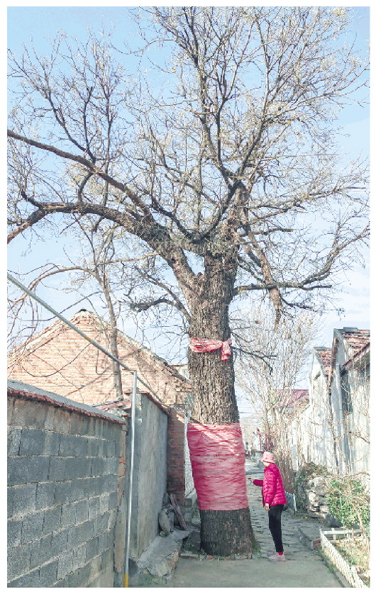 记者沿着村子中心大街向北深入,在一处幽静的小胡同里,一棵别具一格的古槐展现在眼前。它的树干上裹有红绸,粗壮、斑驳的树干上,深浅不一的沟壑恰似岁月绘制的纹路,默默记录着季节的更替和时光的流逝。古槐的部分枝干伸展到旁边一户村民家的房顶上。现在是冬季,树叶大部分落了,簇簇槐角挂满枝头,疏密有致、姿态优美。