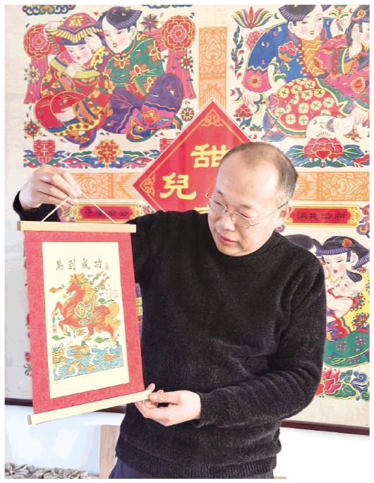 距离农历马年还有一段时间,杨家埠木版年画手艺人已陆续开启“忙年”模式。国家级非遗项目杨家埠木版年画省级代表性传承人杨志滨制作了一组马年题材年画,兼顾传统与创新。图为杨志滨展示年画“马到成功”。 本报记者 郭超