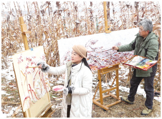12月13日,两名画家在雪后的红高粱地里写生。当日,一场降雪过后,高密东北乡田野里的红高粱被白雪覆盖,美不胜收。我市画家们在冰天雪地中捕捉大自然的静谧与纯净,将瞬间的美感凝固于画布之上,以画笔见证银装素裹的美丽景象。 本报记者 张驰