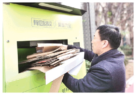枫丹壹号院小区市民赵先生将废弃纸箱投进可回收物智能回收机。