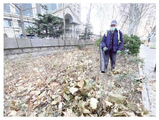 时下落叶季进入尾声,但路边绿化带内仍囤积着不少落叶,12月17日上午,记者在高新区东风东街看到,环卫工人正身背“神器”——吹风机对绿化带内的落叶进行清扫,随后再将落叶堆积、装包,拉到处理场集中处理。 本报记者 刘蒙亮