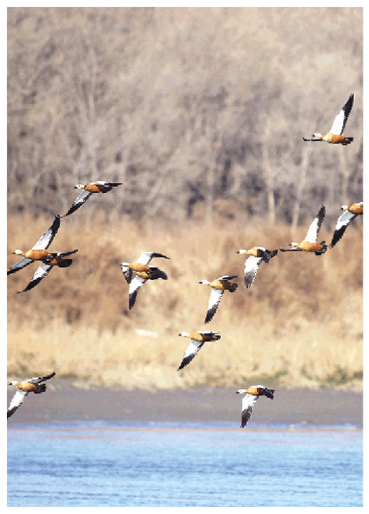 12月21日,在昌邑市龙池镇的丰产河水面上,一群群水鸟在这里栖息。各种鹭类、鸥类和野鸭在河面畅游,其中,赤麻鸭因颜色醒目、体型大,成为独特的存在。赤麻鸭生性警惕,一旦被惊扰便立即起飞,在空中组成队形,直到确认危险解除后才降落到安全区域。 赤麻鸭是雁形目鸭科麻鸭属的鸟类,别名黄鸭、黄凫等。从潍坊南部山区的河流、水库,到北部沿海水面,经常可以看到赤麻鸭的身影。它们主要吃植物嫩叶、茎、谷物种子,同时也以昆虫、小鱼和两栖动物为食。目前是我国三有保护动物。 本报记者 巩建国