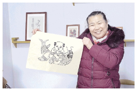 12月18日,潍城区城关街道曹家巷社区开展了一场“传统木版年画进社区”活动,山东省工艺美术大师张运祥现场讲解传统木版年画的制作工艺和历史,居民还体验了木版年画印制的过程。图为居民展示亲手印制的木版年画。 本报记者 张驰
