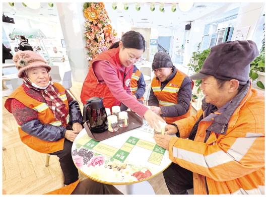 12月25日,在奎文区东关街道民生街社区,工作人员为在“温暖角”休息的环卫工人送上热水。进入冬季日渐寒冷,当日,该社区联合辖区爱心单位打造了一处“温暖角”,为户外工作者开辟避寒场所,免费提供热水、手机充电等服务。“工作间隙,我们能过来喝点热水歇歇脚,真的很贴心、很暖心。”一名环卫工人感慨道。 本报记者 张驰