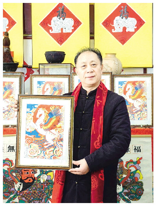 近日,杨洛书木版年画艺术陈列馆馆长张大功在年画创作中融入马年生肖元素,作品《骏马奔腾》用非遗技艺和现代元素烘托出浓郁的年味。
