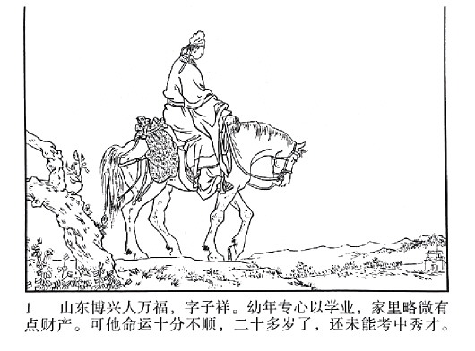 故事说:博兴县读书人万福,因不堪充任乡间役长的徭役盘剥,逃至济南,税居旅店。有一私奔妙龄少女,投其怀抱,两情相悦。女自言为狐所化,渐为朋友所知,以为奇闻,隔三差五找上门来求见仙颜。此女舌绽莲花,作诗答对,令人捧腹而蕴含揶揄。一日集会万福寓所,有名孙得言者出一上联:“妓者出门访情人,去也万福,来也万福(旧时的一种礼节行为)。”请狐女属对,狐女朗声大笑对出下联:“龙王下诏求直谏,龟也得言,鳖也得言。”万福坐于主位,两客分坐左右,狐女借“狐”字笔划说事,望空指书说,右边是一大“瓜”,左边是一小“犬”。诸如此类。