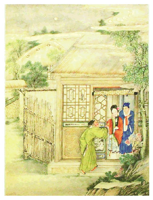 值得注意的是,杨家埠古版“爆仗画”中的男性,都假设为《聊斋》故事中的人物,如《阿宝》中的孙子楚、《连琐》中的杨子畏等。杨家埠木版年画兴盛于清乾隆年间,此时《聊斋志异》早已广泛流传,由此,其中人物来到“爆仗画”中,走进了潍地的乡风村俗。