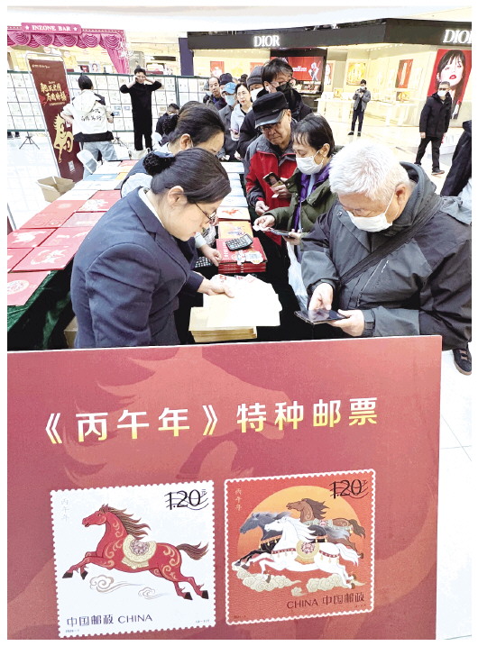 1月5日,在潍坊银座购物中心举行的2026年《丙午年》特种邮票首发活动现场,市民正在购买马年生肖邮票。当日,中国邮政正式发行《丙午年》特种邮票一套2枚,第一枚邮票名为“驰跃宏图”,以“腾跃新时代”为核心意象;第二枚邮票名为“万骏臻福”,以“万马奔腾,驰骋千里”为核心意象。我市不少集邮爱好者前来排队购买,期盼第一时间收获这份“马年惊喜”。 本报记者 张驰