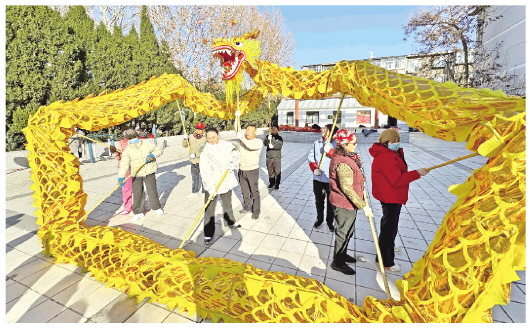 1月7日,记者在奎文区东关街道工福街社区看到,为在春节期间给广大社区居民奉上精彩演出,爱好文艺的居民早早开始了春节文化活动的排练,重头戏舞龙是居民着重进行排练的节目,舞龙时而上下翻腾,时而腾挪盘旋,一招一式间将龙的精、气、神、韵展现得淋漓尽致。 本报记者 张驰