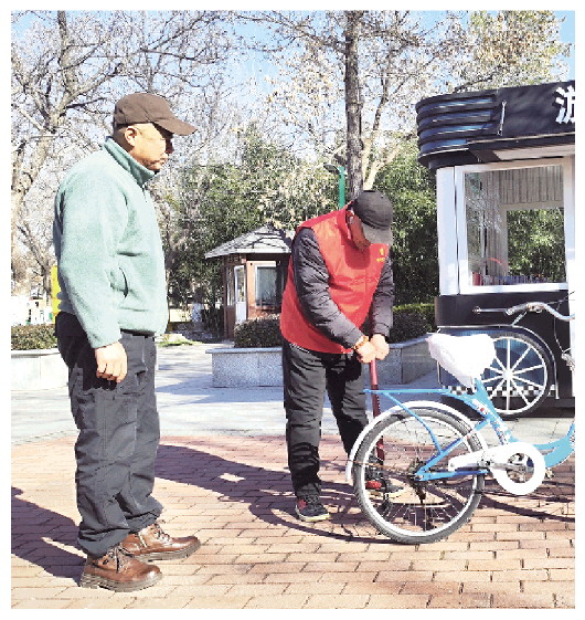 游客服务中心工作人员为市民的自行车打气。