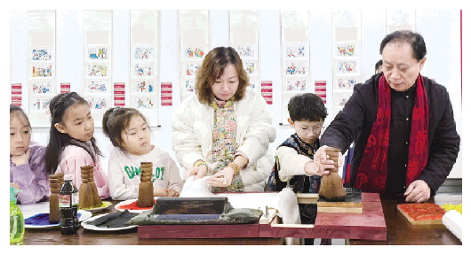 张大功(右一)在展览现场示范年画印制过程。