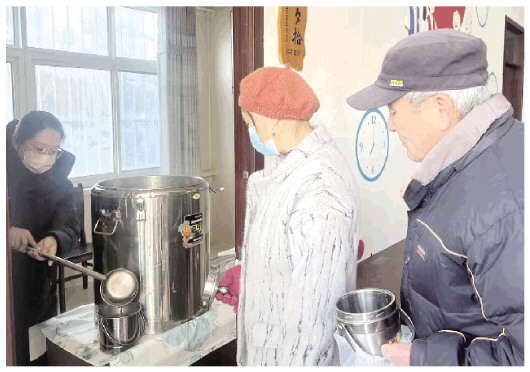 腊八节即将到来,1月20日,奎文区东关街道李家街社区开展“情暖腊八、粥暖人心”活动,不少居民早早来到现场,有序排队领取腊八粥。图为社区工作人员为居民盛粥,还细心叮嘱老人小心烫手、注意防寒保暖。 本报记者 张驰