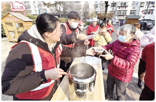 1月25日,在潍城区城关街道曹家巷社区,社区工作人员将熬制好的腊八粥送给居民。俗话说:“小孩小孩你别馋,过了腊八就是年。”腊八节来临之际,城区各社区纷纷开展以“浓情腊八 暖邻同行”为主题的活动,社区工作人员邀请居民一同品尝腊八粥、制作腊八蒜,不仅是传承我国传统节日风俗的体现,更拉满了美好生活的“仪式感”。 本报记者 张驰