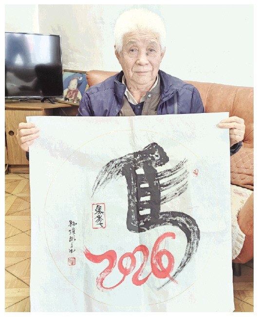在作品《百马纳福》中,100个篆书“马”字结构各异,老人通过简洁的线条勾勒出马的形象,笔墨古朴苍劲,像是从宣纸奔腾而出的“神骏”,呈现一股磅礴欲出的精神气概,中间一个大大的红色“福”字,使得整幅作品更加喜庆、更有韵味。作品《马到福来》同样喜庆,100个篆书“福”字结构各异,墨色浓淡自然变化,中间的“马”字创意十足、格外吸睛,红色的数字“2026”被巧妙嵌入字体中,与黑色的“马”字形成鲜明对比,既突出主题年份,又保持书法整体气韵连贯。