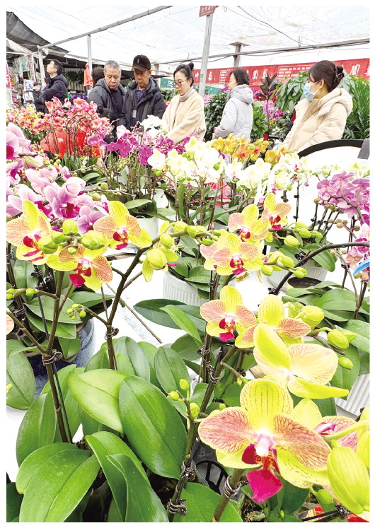2月1日,在城区君泰花卉市场,市民正在挑选心仪的年宵花。春节临近,市民纷纷前往花卉市场选购花卉绿植装点家居。花卉市场里各种花卉竞相开放、争奇斗艳,处处洋溢着喜庆祥和的新春气息。 本报记者 张驰
