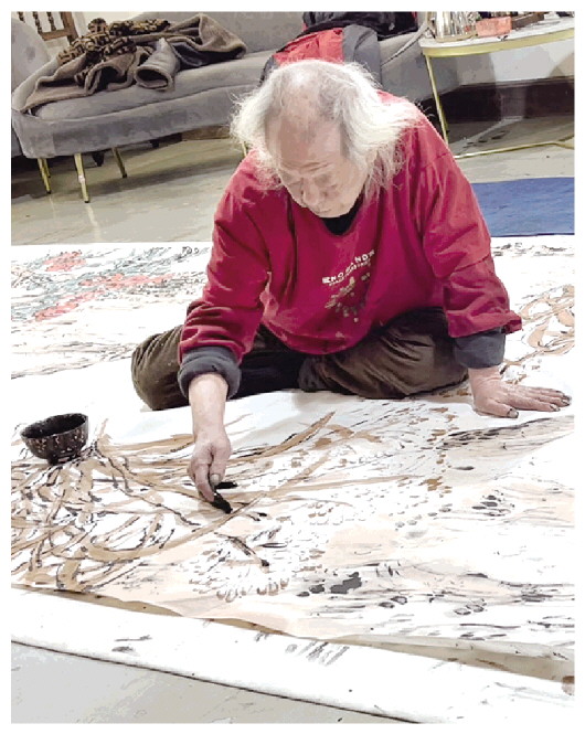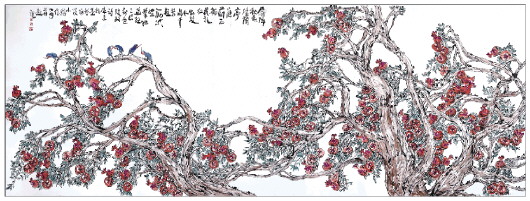 李冰奇新作《繁荣昌盛图》(受访者供图) 李冰奇在创作。(受访者供图) 李冰奇作品《荷合相生》(受访者供图) 七十余载人生沉浮,东西方文化跨界求索,李冰奇以指为笔、以墨为魂,将个体生命的孤微吟哦,升华为家国天下的浩荡抒怀。从承袭八大山人的孤高风骨,到海外漂泊的文化探寻,他在“享受困苦、消化艰辛、发现希望”的生命洗炼中,完成了从画家到文化担当者的蜕变,终以指尖泼染的山河意象,让个体的创作悄然汇入大我担当的时代脉动。诗画共生,笔墨载哲思 李冰奇的艺术,始终浸润着“诗画同源”的文人风骨,其文画合一的造诣,是技法与哲思的深度交融。中国国家画院原院长刘勃舒曾赞之:“冰奇的画作有文化修养、哲学思维在里面,以画载诗,实属难得。” “我以诗的反讽与借喻延续绘画,赋予作品文学厚度。”李冰奇所言的文学性,绝非题诗配画的表层结合,而是诗与画的双向赋能——画为诗立形,诗为画铸魂。他的题画诗直抒胸臆又意蕴深远,“任性宁直绝不弯,横斜竖立待求变。今日收拾回家去,任它巧手万般编。”彰显其坚韧刚毅的艺术风范;“风也、雨也、雪也,铸松品也;酸也、甜也、苦也,造人生也。”则将岁月磨砺与生命感悟凝聚于笔端,诗与画的交融浑然天成。其笔下贯穿始终的“黑鸟”意象,便是诗画共生的核心载体,更是其生命哲学的具象投射。“黑鸟对天叫声急,两树相扶正依依。春风乍暖天又寒,犹恐新绿不逢时。”画中黑鸟,承八大山人之孤高,却无愤世之冷傲,尽显历经沧桑后的从容笃定。 这只黑鸟,是李冰奇的精神化身。早年困顿时,黑鸟栖于寒枝、眼神倔强,墨色沉郁间藏着“风雨侵衣骨更坚”的抗争;晚年心境澄明后,黑鸟疏朗栖枝、神态安然。“惊它回首龟同寿,立在枝上何言愁。一旦风雨稍后过,洗罢往事共春秋。”画中线条与诗中哲思相印证,让作品兼具视觉冲击力与精神穿透力。品读其作,品画形,更读诗心,黑鸟便是连接形与心的纽带,让艺术超越视觉,成为承载生命哲思的精神载体。 这份以笔墨锚定诗心、以物象承载哲思的创作路径,正是中国画大写意艺术一脉相承的精神内核。中国画的大写意以老庄哲学为根基,融合诗词、书法艺术,是中国书画之魂,集中展现了中国人的内在审美与高远意境。然而,由于大写意“成家”难度大,需兼具深厚的文化底蕴、精湛的技艺与高尚的品格,近现代以来从事者日渐稀少。 作为当代指墨大写意的领军人物,李冰奇深知自己的使命。他在谈到绘画的最终目的时说:“绘画一旦进入对历史不负责任的流形式,享乐主义、功利主义就会浮上来。”这份批判,源于他对艺术纯粹性的坚守,这份担当,让他超越了个人的艺术追求,成为指墨大写意艺术的守护者与传承者。苦修不辍,担当铸艺魂 对于李冰奇而言,艺术成就从来不是天赋的偶然馈赠,而是艰难困苦淬炼的扎实积淀。他的“苦修之志”,贯穿于艺术之路的每一步,历经皮肉之苦和精神之苦,成就其人生哲学的绝然风骨。 李冰奇艺术之路的苦,首先是深入骨髓的皮肉之苦。他的指画绝非炫技之作,而是以磨掉数层皮的苦修,探索水墨与手指结合的极限,终达“心指相通”的境界。毛笔的弹性可收可放,而手指肌肤脆弱,蘸墨过多则洇成墨疙瘩,蘸墨过少则拖拉不开,难以呈现层次丰富的墨色变化。为攻克这一难题,李冰奇将自己关在屋里整月不出门,反复摸索水墨与手指的融合之道,手指磨出血泡、结出厚茧是常态,甚至曾因过度劳作导致手指皮肤反复破损脱落。他独创“指掌并用的洒墨法和洒色法”,将其与泼墨、积墨等传统技法有机结合,使指墨呈现出浓淡、枯润、干湿层次丰富的艺术效果,小幅盈尺见奇巧,巨幅丈八气吞山河。 比起有形的身体磨砺,那无形的心志磨练,才是他艺术灵魂得以挺拔的真正脊梁。李冰奇深切认同吴冠中的观点,画家要吃得苦,才有感情和心灵的波动,这样的作品经过历史考验,才能流传下来。 面对创作的自我突破之“苦”,他将苦转化为艺术创作的精神养分。他在享受艰难困苦中发现希望,站在未来看现在。这种坦荡荡的豁达,让他的画作尽显生命的韧性与张力。家国情怀,大我映山河 李冰奇艺术境界的最高跃迁,是从小我的技艺锤炼、情绪表达,升华为大我的家国关怀、人类共情。这份担当,是岁月沉淀后的精神自觉,是对民族复兴、世界和谐的深切期许。 从早年潜心小我、取法八大山人的孤高抒怀,到远赴海外、在文化碰撞中寻求融合的探索期,再到历经漂泊后沉淀升华,最终以“文化飞散者”的自觉,在艺术上彻底挣脱桎梏,与家国命运紧密相连。 这份升华,在《荷合相生》与新版《繁荣昌盛图》中展现得淋漓尽致。十米巨作《荷合相生》,以“荷合”谐音“和合”,借莲荷意象隐喻社会和谐、民族和睦、人类共生。其独创洒墨洒色技法,勾勒出荷叶舒展、荷花绽放、鱼群游弋的生机图景,笔墨淋漓间,是对家国安宁、世界大同的深情祝福。 《繁荣昌盛图》是李冰奇二十八年前作品的同名之作。新作中,早年那种试图融合东西方文化的强烈张力,已沉淀为一种更为纯熟与深厚的表达。画中老石榴树的枝干以浓淡墨色皴擦点染,肌理嶙峋如苍龙游走,枝头石榴垂垂欲坠,殷红的果皮下仿佛漾着饱满的籽粒。石榴的美好寓意与“繁荣昌盛”的时代期许在此交融,自然物象由此承载起家国兴旺的深切祈愿。 不执于