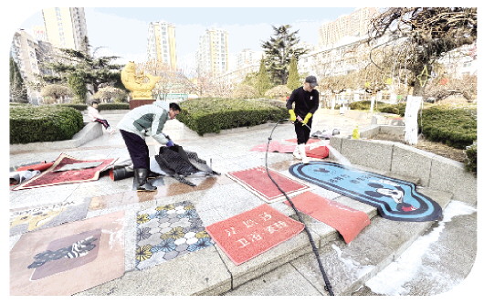 为给业主提供更加舒适的生活环境,2月4日,高新区福海花园小区开展“地垫焕新 共迎新春”便民服务活动。物业人员将业主送来的地垫铺好,开始分工协作:有的洒清洁剂,有的持高压水枪冲刷,一张张地垫焕然一新。 本报记者 张驰
