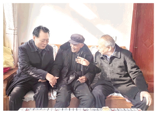 每到一户,慰问组成员都与老兵促膝长谈(上图),细致询问身体状况、生活起居及实际困难,并送上棉被、米面油、调味品和“福”字等慰问品。