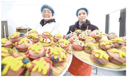 2月4日,在河南省洛阳市西工区红山街道枣园社区花馍工坊内,工人展示制作好的花馍。新春将至,年味渐浓。各地举办年货大集以及写“福”字、春联等活动,人们选购鲜花、中国结等饰物,迎接新春。 据新华社
