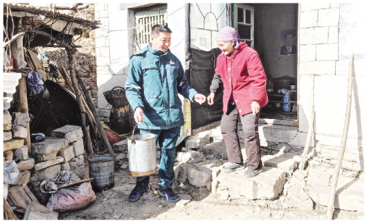 岳玉强(左)帮90岁的李元花老人打水。