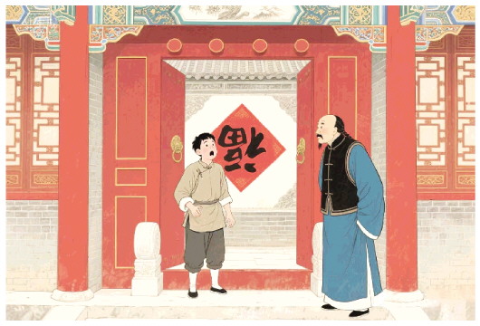 年初一大清早,按照乡间风俗,扛小长活的要打上灯笼,早早去给东家掌柜拜年。发财到那里一看,脑袋“嗡”地一声胀得斗大——除夕真是昏了头,竟把影壁上的“福”字贴了个脚朝上、头朝下。