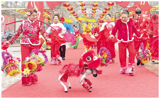 3月3日是元宵节,潍坊市金宝乐园开展了一场民俗展演活动。在活动现场,一只机器狗穿戴着传统舞狮服饰,一扭一踩精准卡点,为游客带来舞狮表演,引来阵阵喝彩。 本报记者 张驰 通讯员 郭丹