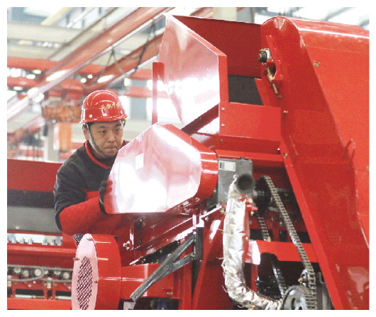 3月16日,在山东省高密市天凯中锐机械科技有限公司,工人在生产线上装配智能农机设备。