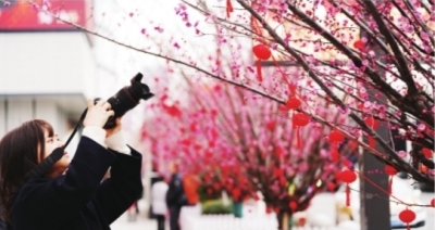 | 市民在武商MALL购物中心门前赏梅拍照。 李子云 摄 |