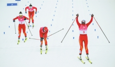 | 2月8日,李磊(右一)冲过终点后庆祝夺冠。 新华社记者张龙 摄 |