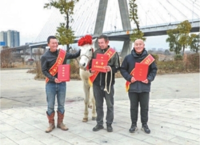 2月6日上午,湖北省仙桃见义勇为基金会授予依立拜、苏邵高和刘杭州“仙桃市见义勇为先进群体”称号,为“白龙”佩戴大红花,身穿大红马衣,一同接受表彰。