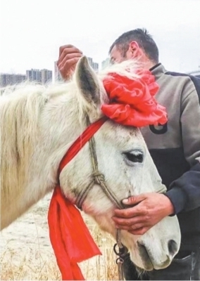 2月6日,记者在表彰现场看到,“白龙马”穿上了保暖的“衣服”,头戴红绸,与骑马救人三人组一同接受见义勇为表彰。