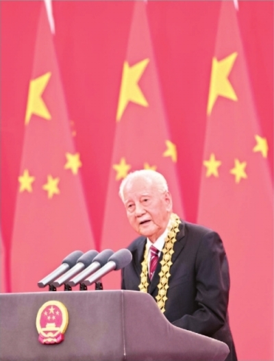 | 2019年9月29日,中华人民共和国国家勋章和国家荣誉称号颁授仪式在北京人民大会堂隆重举行。“共和国勋章”获得者代表黄旭华在仪式上发言。 新华社记者丁海涛 摄 |
