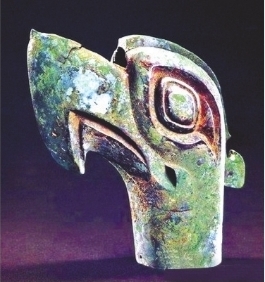 卷鼻结界兽形象则综合了三星堆的青铜大面具、金面罩青铜人头像、青铜兽面具和青铜鹰形铃等多种元素。最明显的表现在于卷鼻结界兽的卷鼻子,这一设计与青铜大鸟头的嘴部造型极为相似。这个鸟头通高40.3厘米,是三星堆遗址出土的鸟类造型器物中体量最大的。鸟与蜀族之关系极为密切,几代蜀王直接以鸟为名,也证明了这一点。