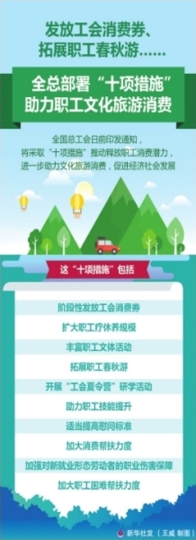 发放工会消费券、扩大职工疗休养规模、拓展职工春秋游……全国总工会日前印发通知,将采取“十项措施”推动释放职工消费潜力,进一步助力文化旅游消费,促进经济社会发展。