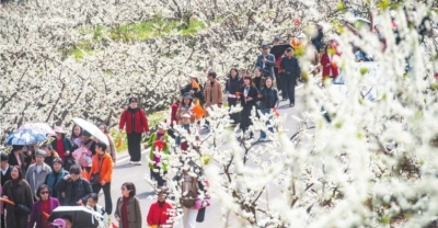 | 近日,位于重庆市巫山县境内的长江巫峡两岸,李花竞相绽放,吸引了大量游客前来观赏。 新华社发 |