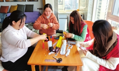 | 巧手妈妈委员会手工教学负责人梅霞(中)教居民做手工。 |