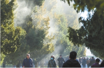 | 上图:近日,在北京天坛公园,柏树像“冒烟了”一般,花粉如烟雾般笼罩在通往祈年殿的步道上空。 新华社发 |