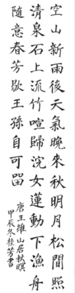 | 《山居秋暝》 唐代王维 作者:钟桂芳(56岁) 指导老师殷辉武汉经开区江大园社区 |