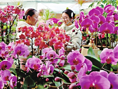 顾客在山东省枣庄市市中区一家花卉市场选购年宵花。(资料图片)