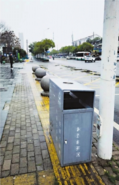 | 盲道上的石墩和垃圾桶。 市民供图 |